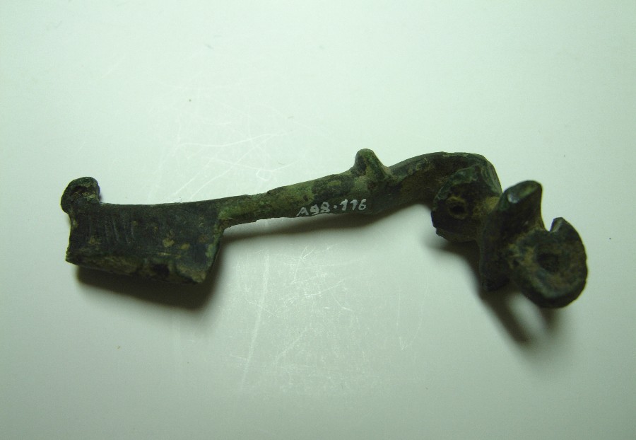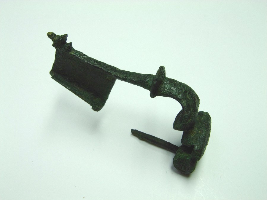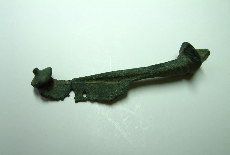 Frgt. einer kräftig profilierten Fibel, gestreckter Fuß mit scheibenförmigem Fußknopf und doppelt gelochtem Nadelhalter. Almgren 68 (oder 73).