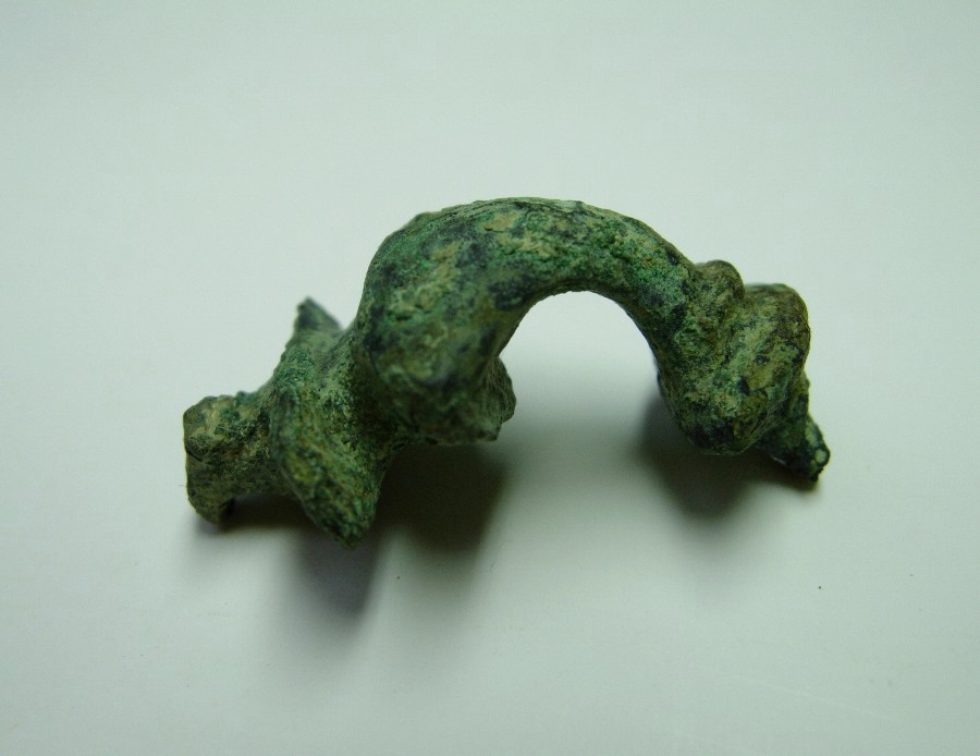 Frgt. einer zweigliedrigen Spiralfibel, Spirale und Nadel fehlen. Bügelfuß hinter dem Bügelknopf abgebrochen. Jobst 4C.