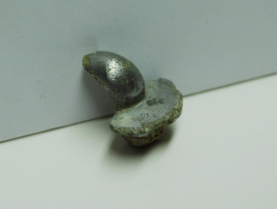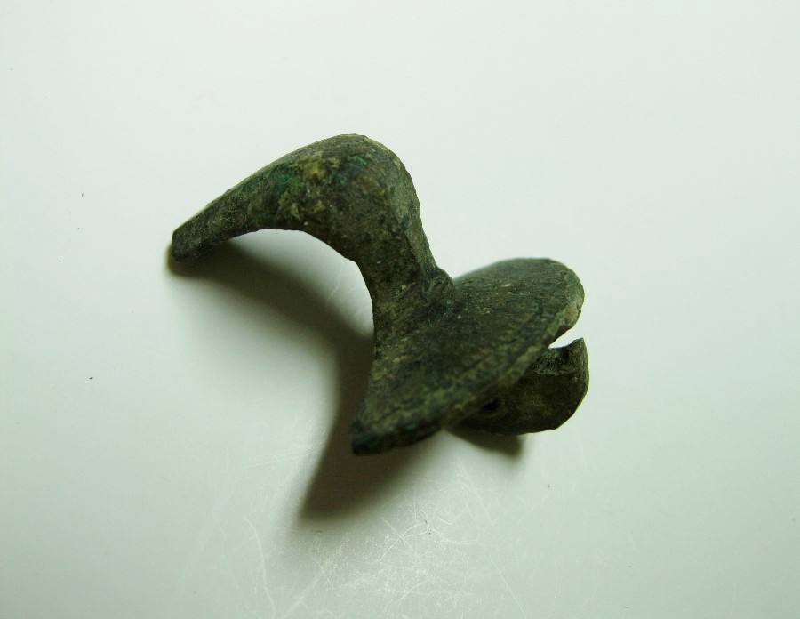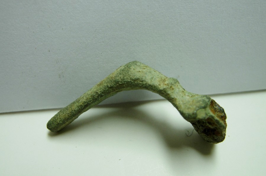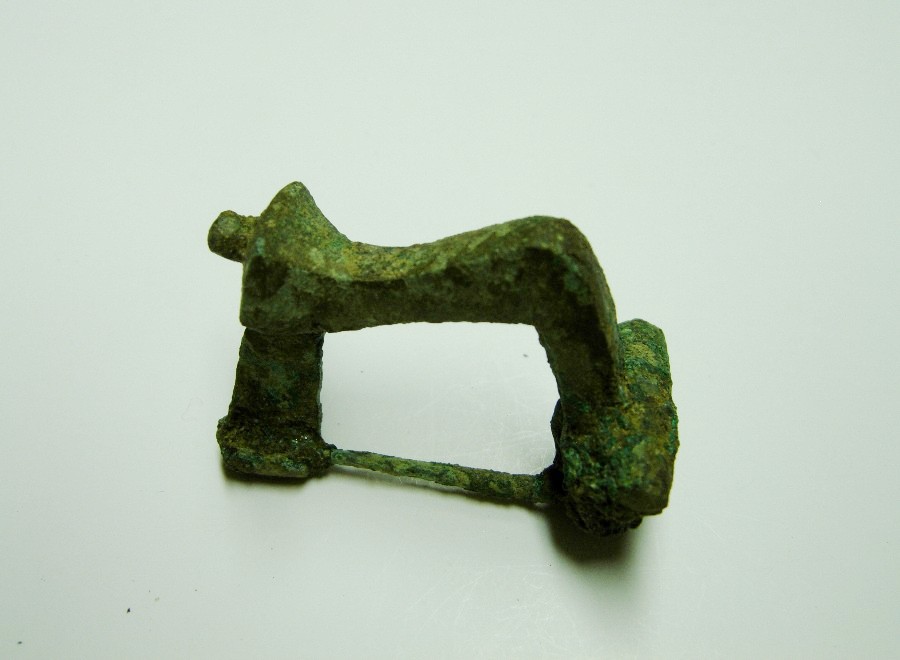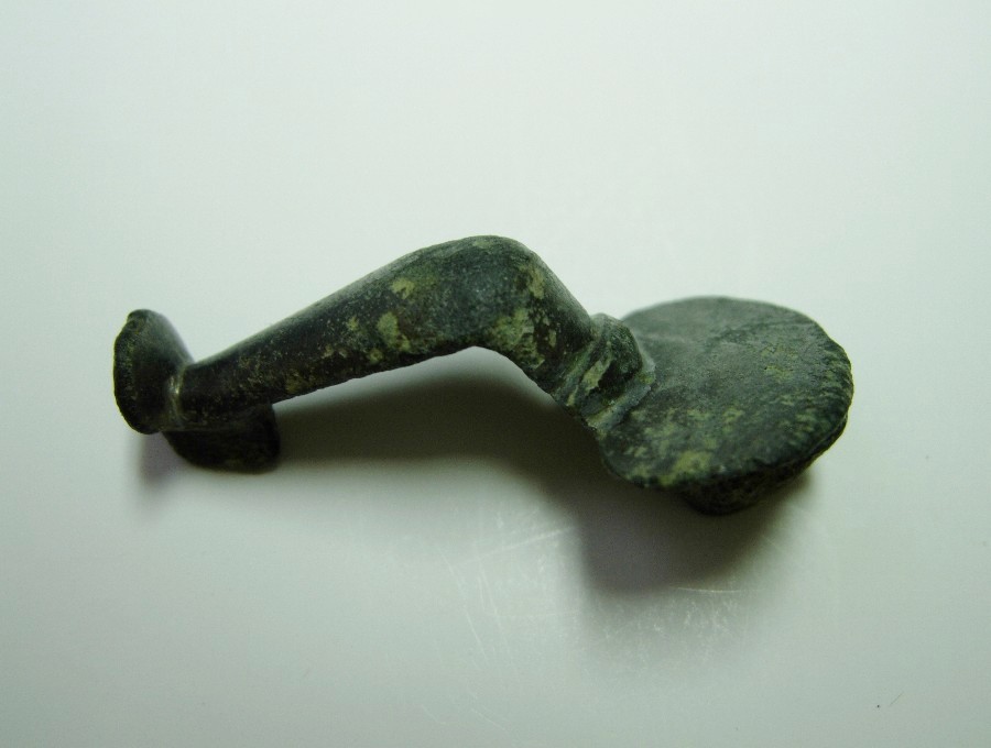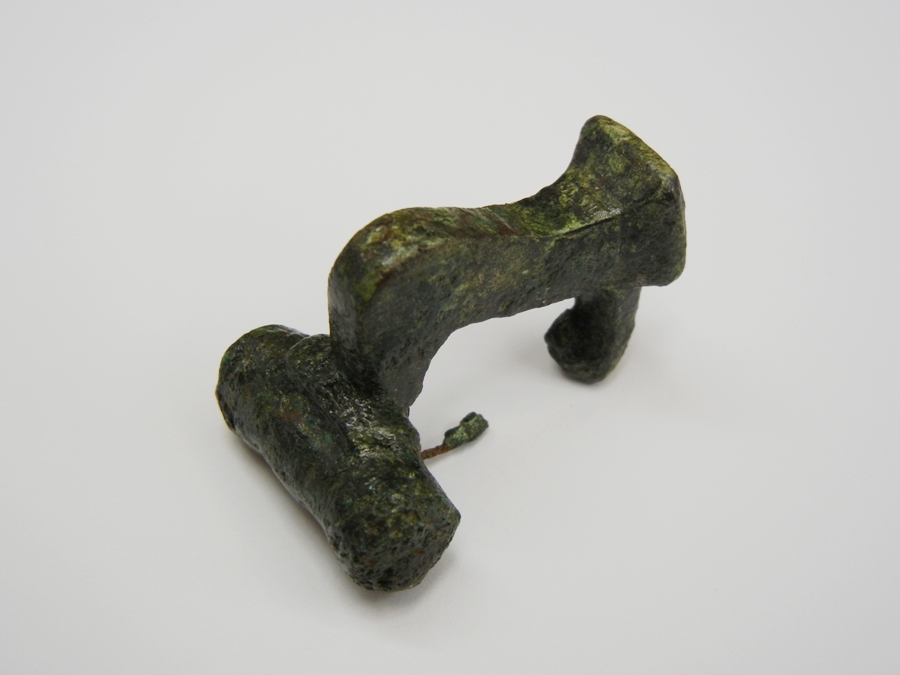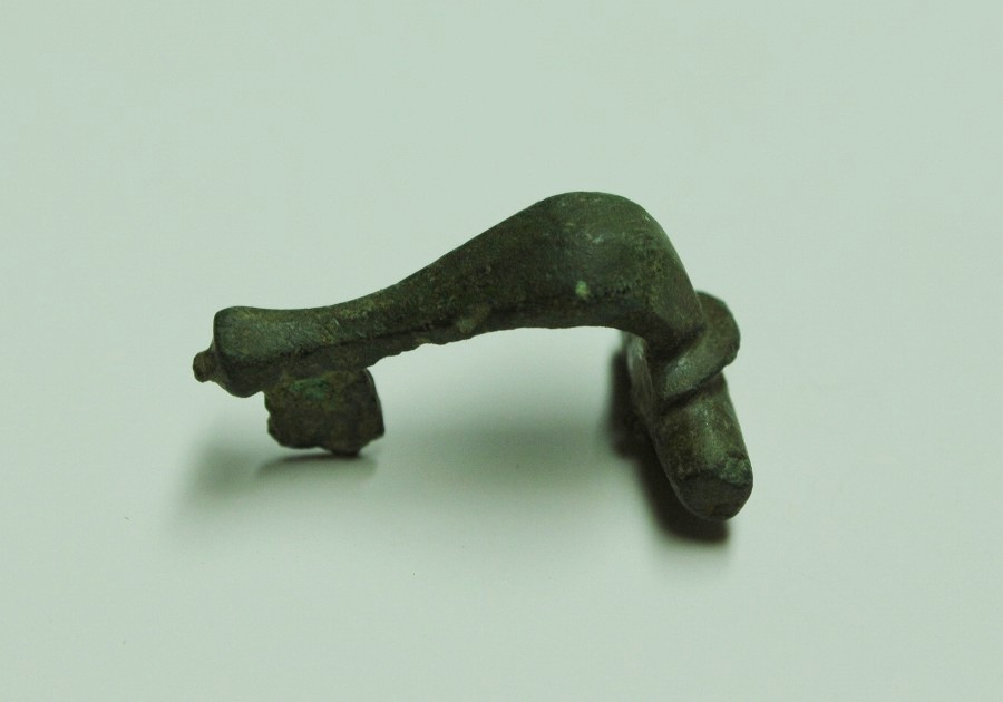 Kniefibel mit halbrunder, unverzierter Kopfplatte. Zweigliedrige Spiralfibel, am Bügelende am Übergang zum Fuß abgebrochen. Spirale und Nadel fehlen.