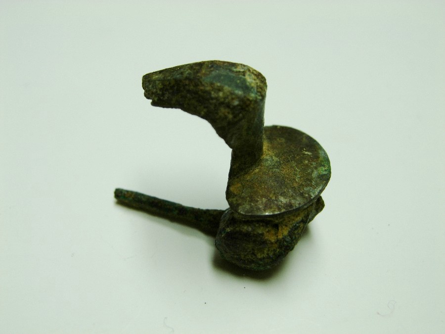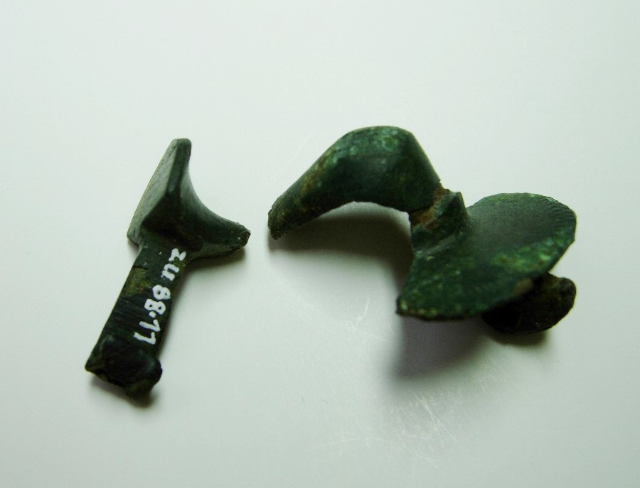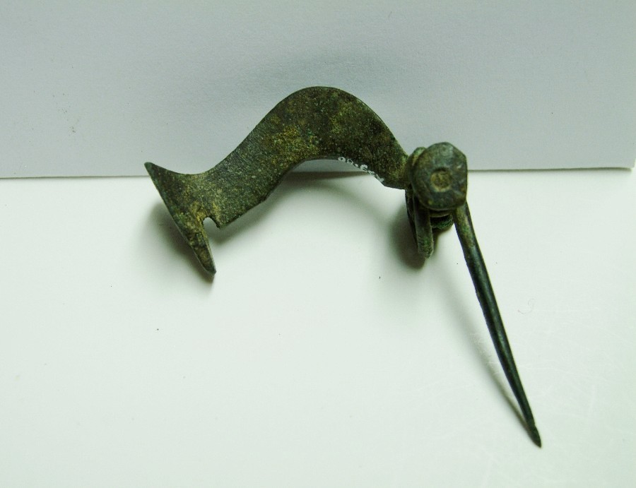 Kniefibel mit halbrunder Kopfplatte mit randlichem Wolfszahndekor. Zweigliedrige Spiralfibel mit oberer Sehne, Spirale und Nadel fehlen. Halbkreisförmiger, gerade abgeschnittener Fuß mit schmalem Nadelhalter, teilweise abgebrochen.
