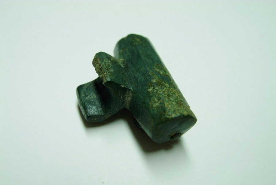 Kniefibel mit Spiralhülse. Frgt. einer zweigliedrigen Spiralfibel mit facettiertem Bügel, am Übergang vom Kopf zum Bügel abgebrochen. Bügel sitzt ohne Zwischenglied auf der Hülse.