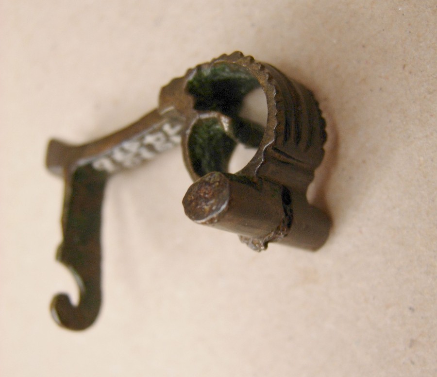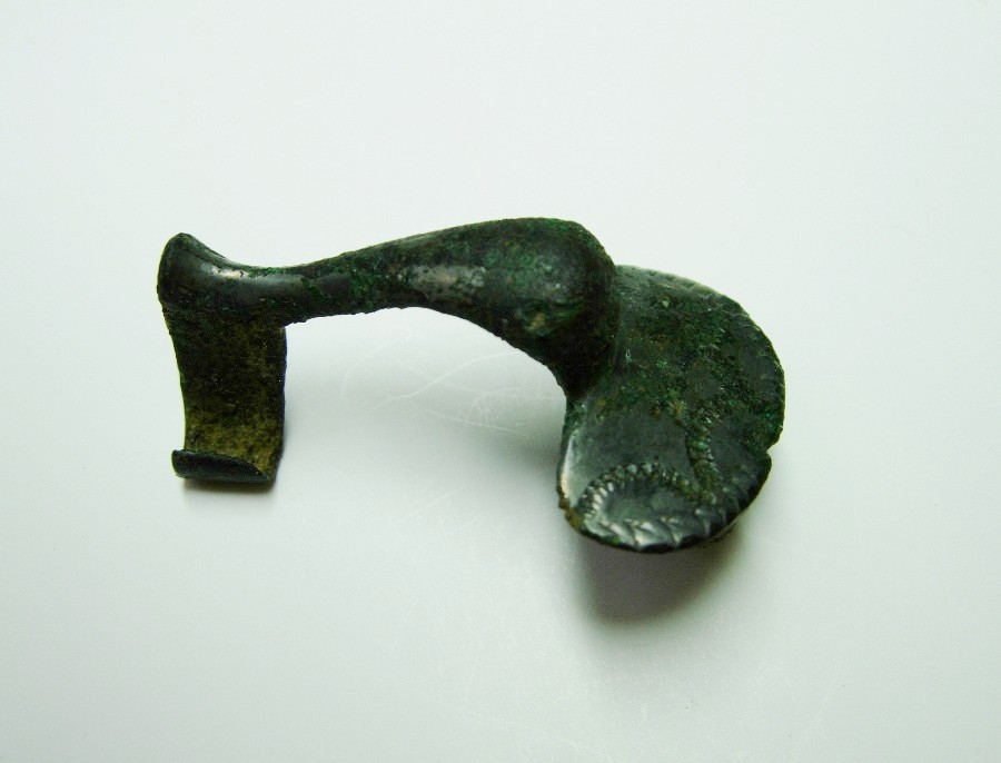 Kniefibel mit halbrunder Kopfplatte mit randlichem Wolfszahndekor. Zweigliedrige Spiralfibel mit oberer Sehne, Spirale und Nadel fehlen. Gerade abgeschnittener Fuß mit hohem, schmalem Nadelhalter. Bügel am Übergang zum Fuß gebrochen, beide Teile erhalten.