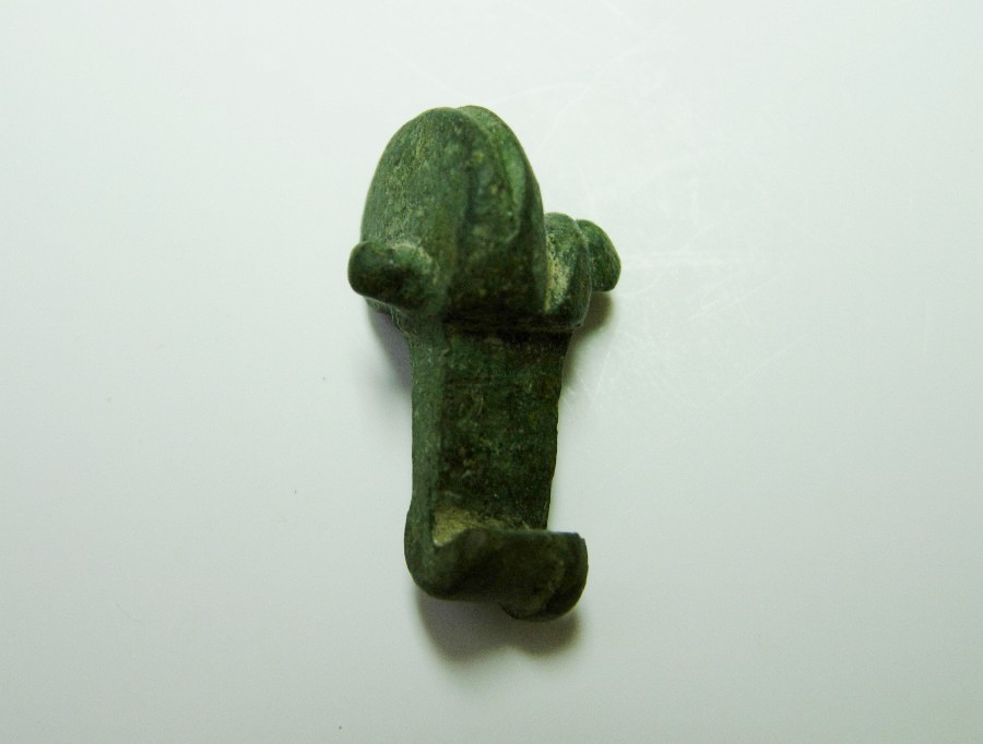 Kniefibel mit Scharnierkonstruktion. Zweigliedrige Scharnierfibel, Nadel fehlt. Längsprofilierter Kopf und Bügel mit flachrechteckigem Querschnitt und quergestelltem Nadelhalter. Bronze.
