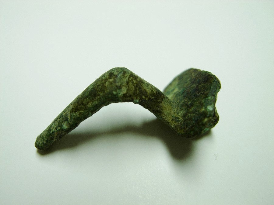 Frgt. einer Kniefibel mit Spiralhülse. Zweigliedrige Spiralfibel. Spirale mit 10 Windungen und unterer Sehne, am Übergang vom Kopf zum Bügel abgebrochen.