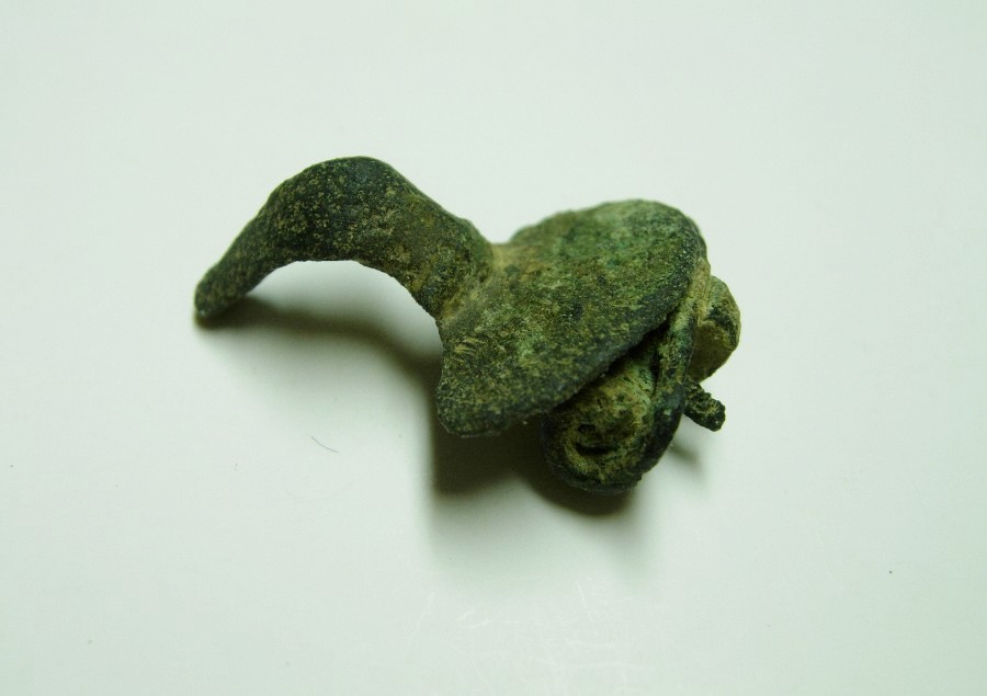Kniefibel mit halbrunder Kopfplatte mit randlichem Wolfszahndekor. Zweigliedrige Spiralfibel mit unterer Sehne, Teil der Spiralkonstruktion und Nadel fehlen. Die Fibel ist in der Bügelmitte am Übergang zum Fuß abgebrochen.