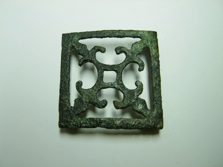 Durchbrochen gearbeiteter, annähernd quadratischer Gürtelbeschlag mit je einem Befestigungsstift in den Ecken. Bronze.