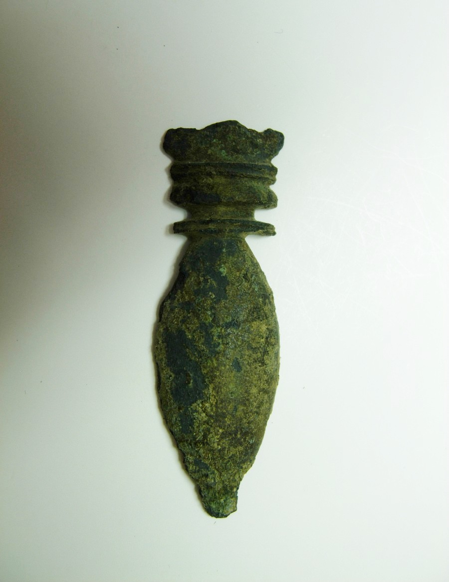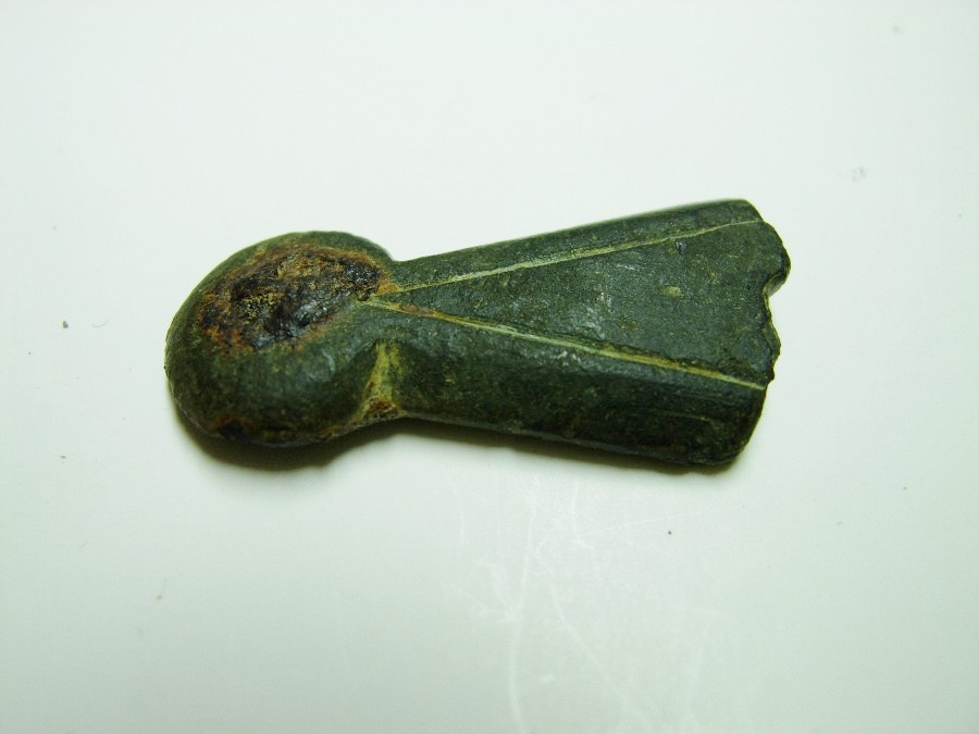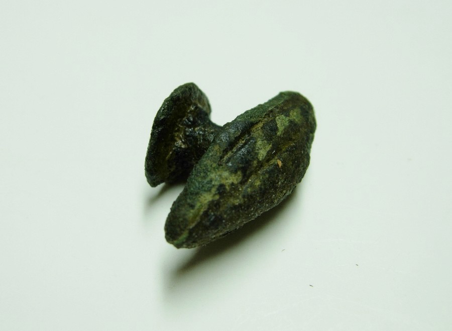 Spitzovaler Riemenbeschlag (Verschlußknebel) mit gewölbter längsprofilierter Kopfplatte und Befestigungsstift mit Gegenknopf auf der Unterseite, stark korr. Bronze.