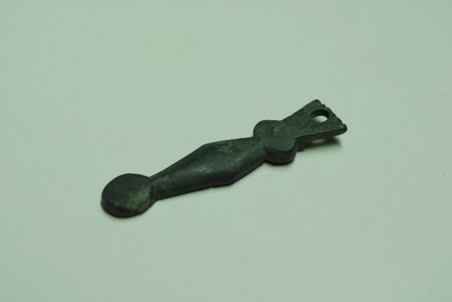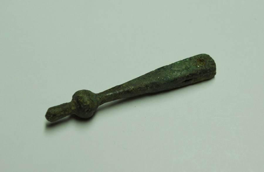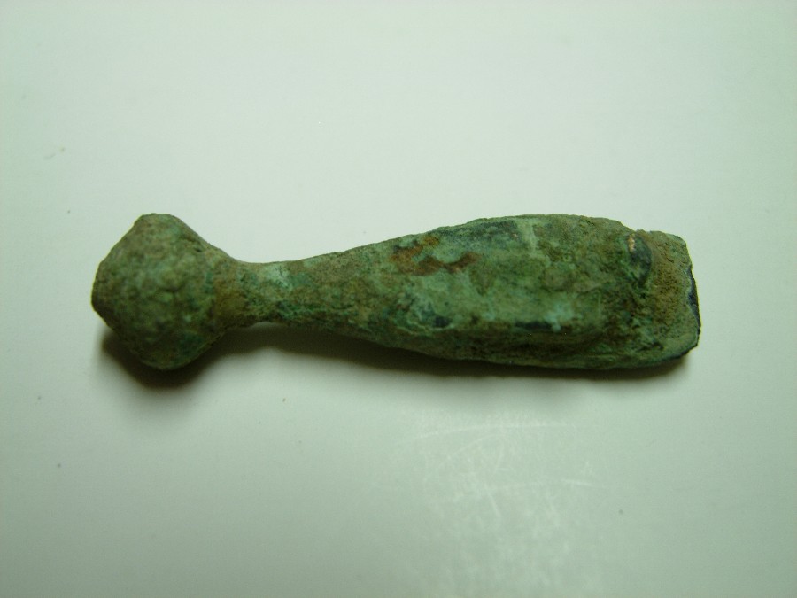 Riemenendbeschlag mit erhaltenem Nietstift in der Zwinge, profiliertem Mittelteil und kugelförmig verdicktem unteren Abschluß. L. 4 cm, B.0,8 cm. Bronze.