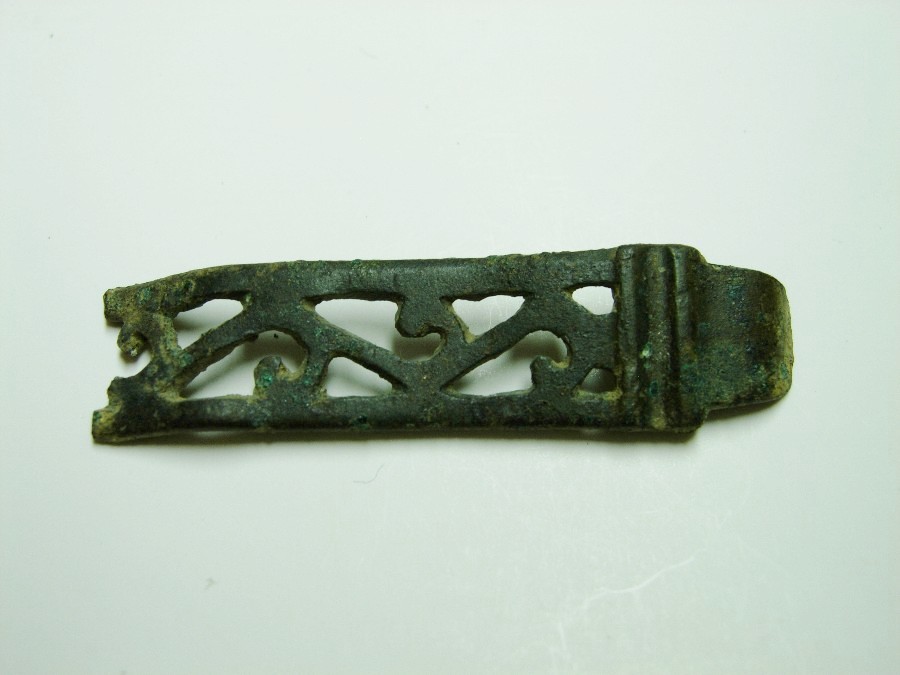 Durchbrochen gearbeiteter Riemenbeschlag mit zwei kleinen Befestigungsstiften auf der Rückseite. L. 6,6 cm, B. 3,6 cm. Bronze.