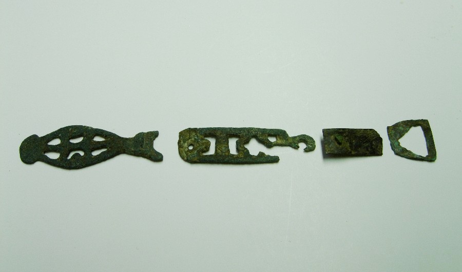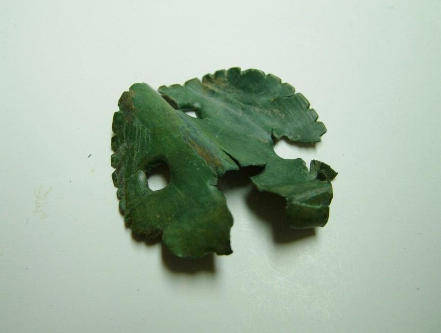 Frgt. eines durchbrochen gearbeiteten Riemenendbeschlags mit Nietplatte und -stift, abgebrochener trapezoider Öse, zugehörigem nierenförmig durchbrochenen Anhänger mit ovalem flachen Abschluß. Bronze.