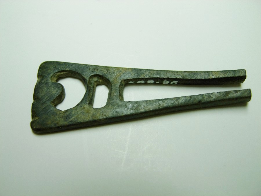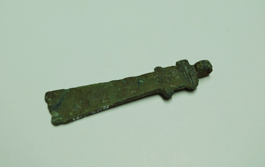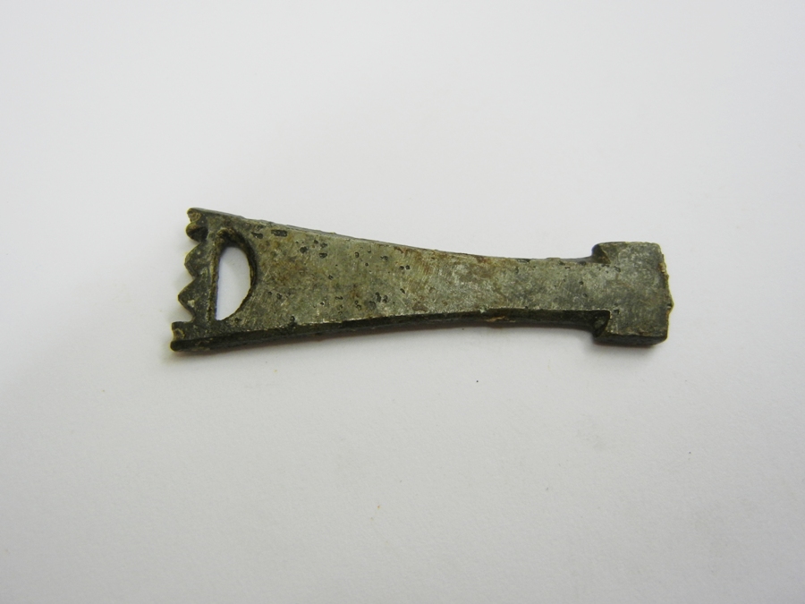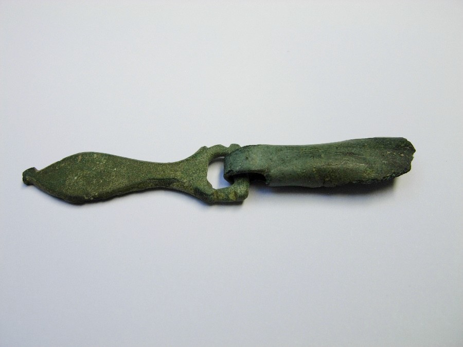 L. 4,6 cm, B. 1,5 cm. Bronze, verzinnt.