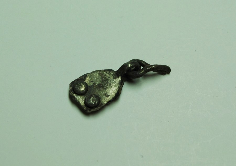 Frgt. eines Riemenendbeschlags, der mittels zweier Nieten am Riemenende befestigt war. Unterer Abschluß mit Öse, in der noch Reste der Aufhängung eines Anhängers erhalten sind. Silber.