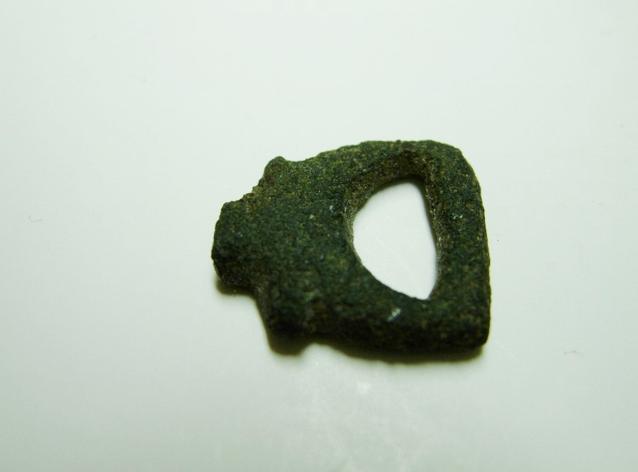 Frgt. eines Anhängers eines Riemenendbeschlags mit D-förmiger Öse. Bronze.