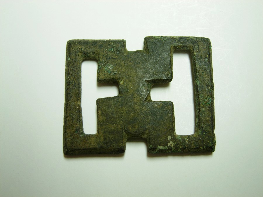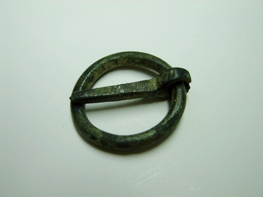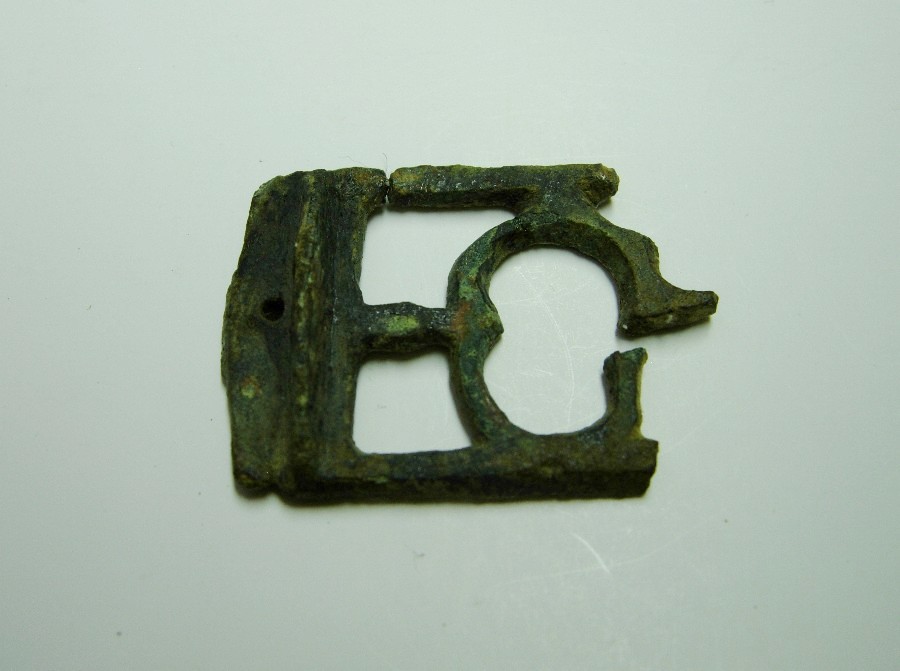 Gürtelschließe mit außen und innen abgeschrägtem Bügel und T-förmiger Öse, Dorn fehlt. Bronze.