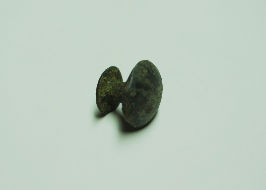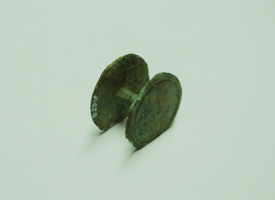 Doppelknopf mit flacher Kopfplatte mit randlicher Drehrille und zentralem Drehloch, leicht frgt. Bronze.