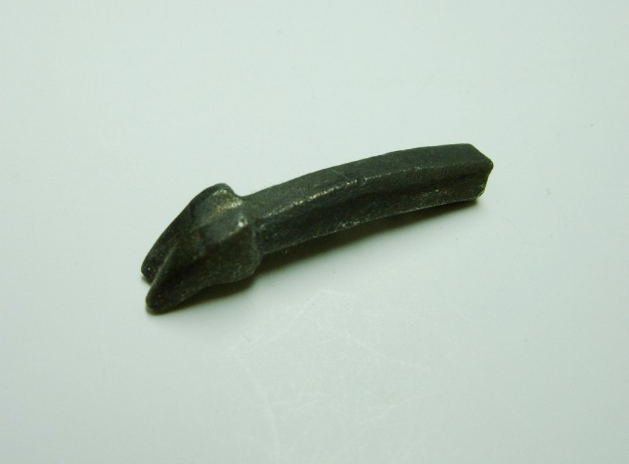 Frgt. eines polygonalen Dorns einer Gürtelschließe, mit profiliertem Kopf mit Einkerbungen, der zur Spitze abflacht. Silber.