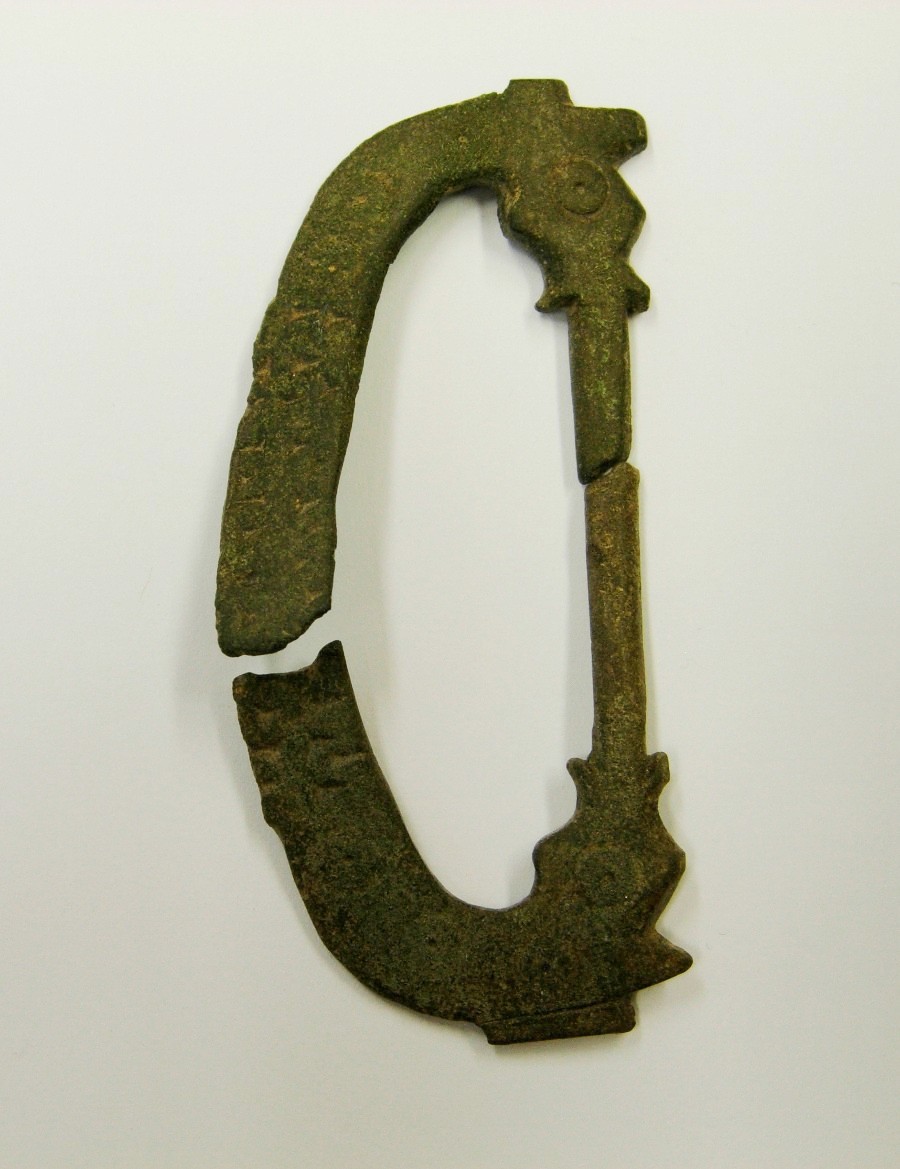 Schließenbügel eines spätrömischen Militärgürtels. Der flache, mit Kreisaugen und Kerbpunzen verzierte Bügel läuft in zwei stilisierte Tierköpfe aus. Der Bügel ist in zwei Teile zerbrochen. Beschlagblech und Dorn fehlen. Bronze.