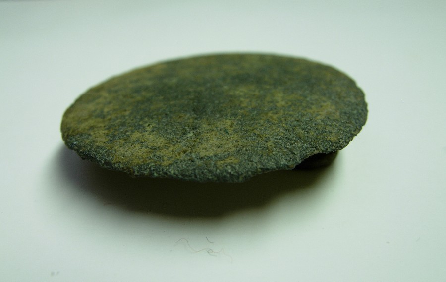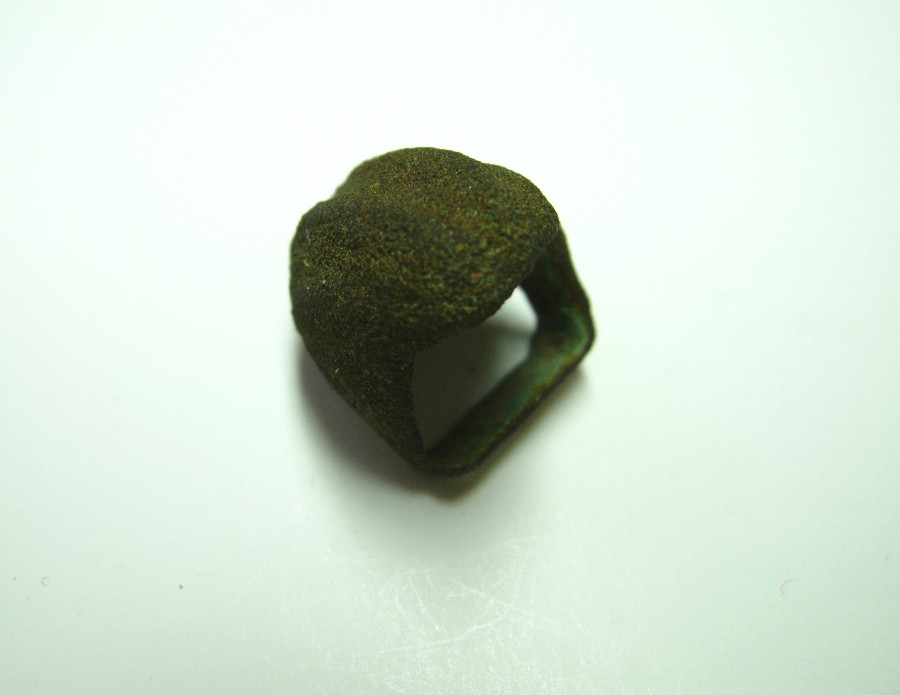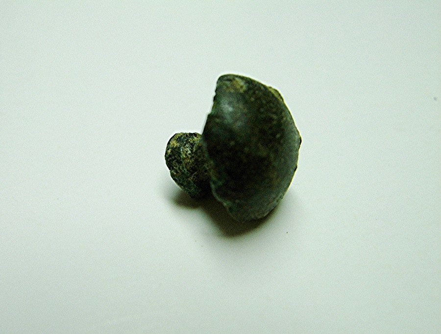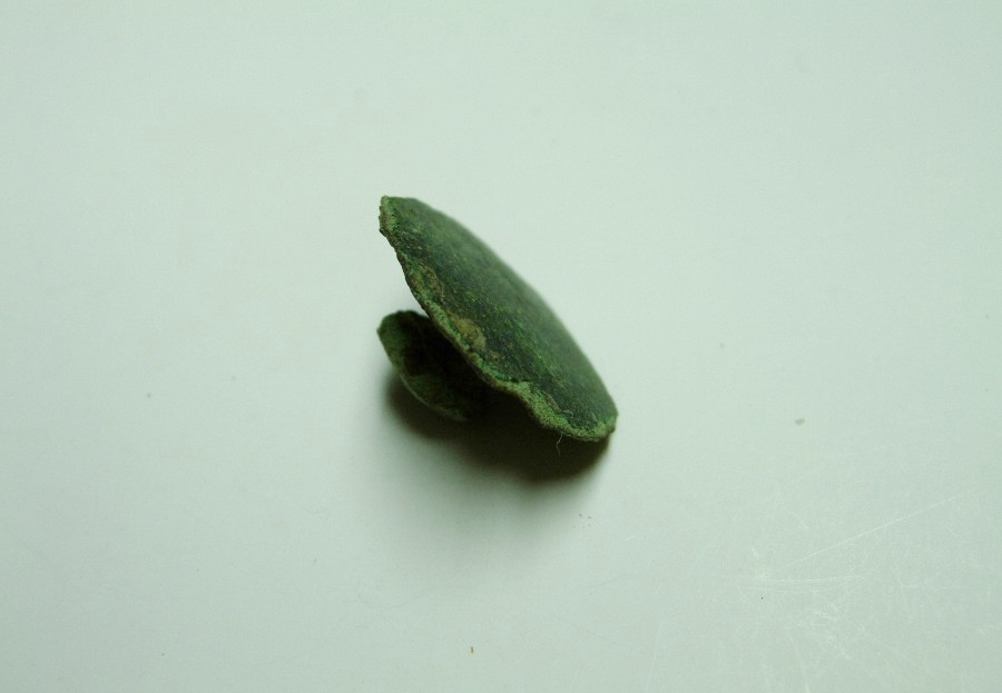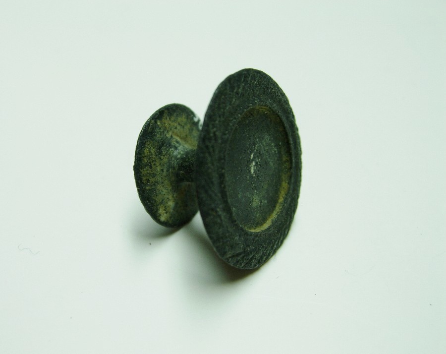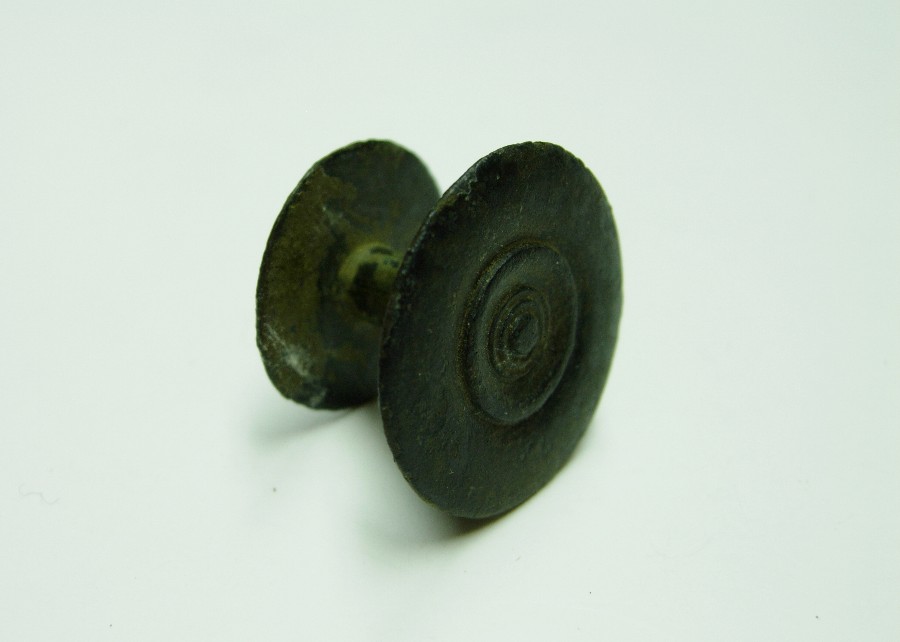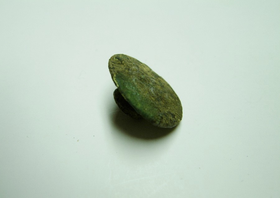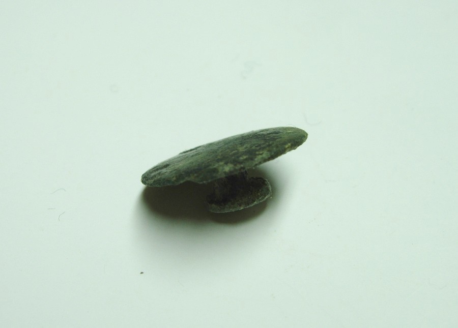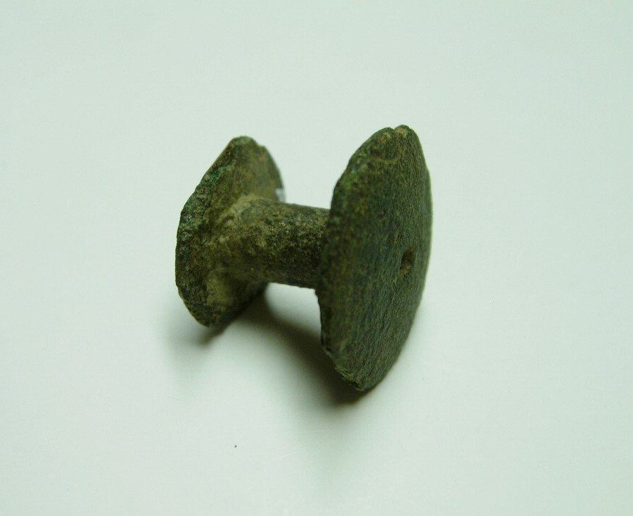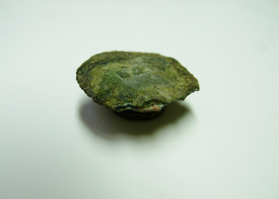 Doppelknopf mit leicht gewölbter massiver Kopfplatte und zentralem Drehloch, im Randbereich stark korr. Bronze.