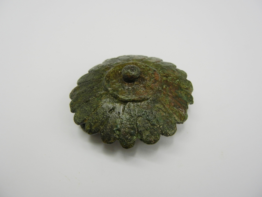 Rosetten- oder blütenförmiger Riemenbeschlag mit aufgewölbter Kopfplatte und zentralem kugeligen Knopfaufsatz; auf der Rückseite zwei massive Befestigungsstifte mit Gegenknopf. Dm. 4,8 cm, H. 2,3 cm. Bronze.