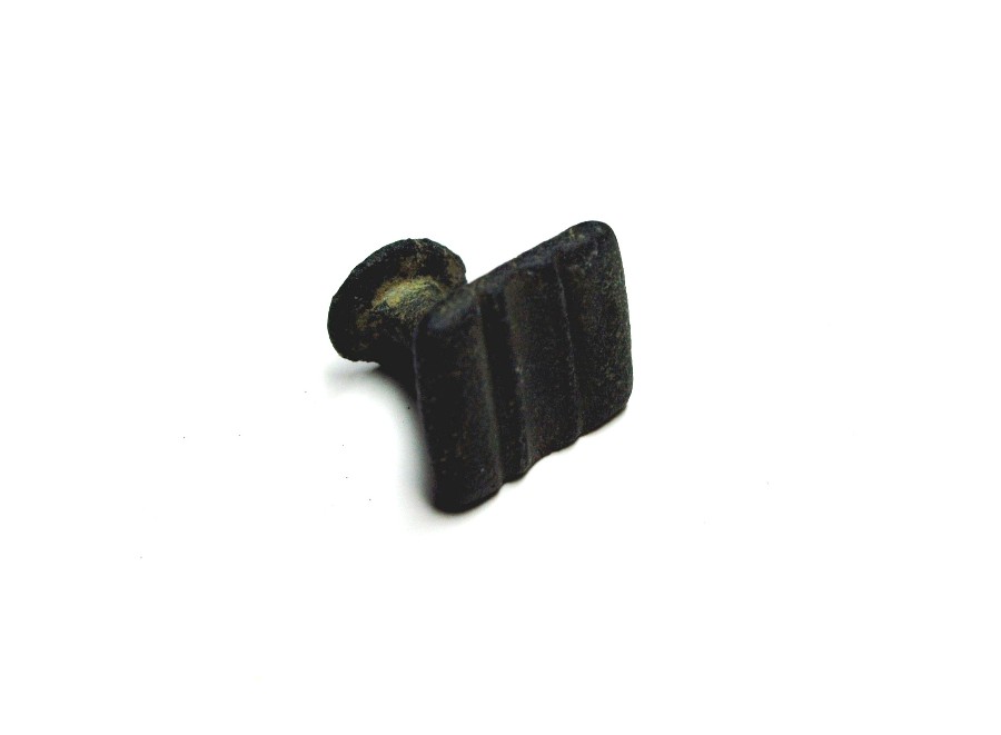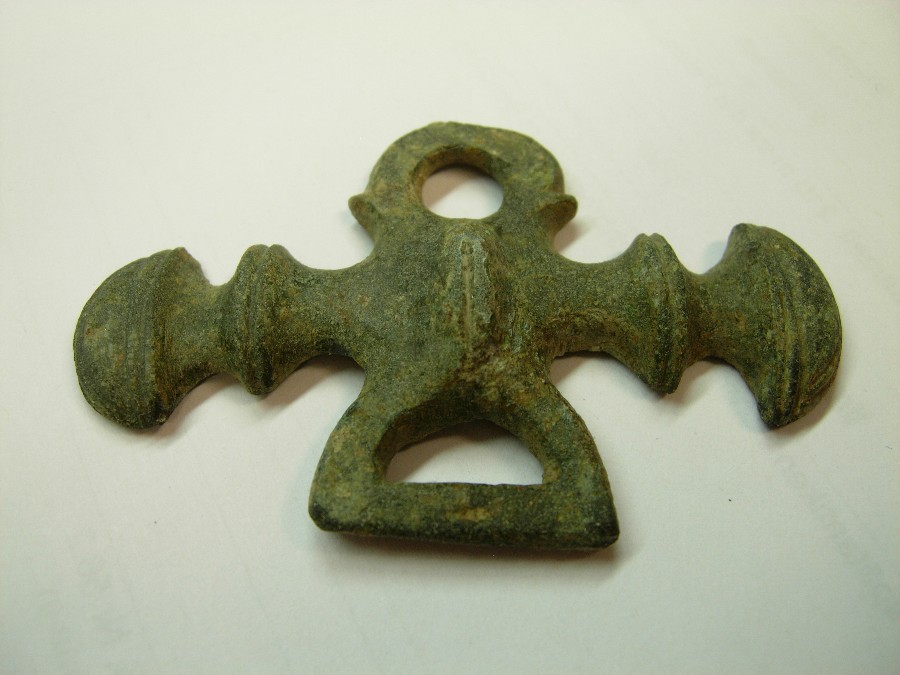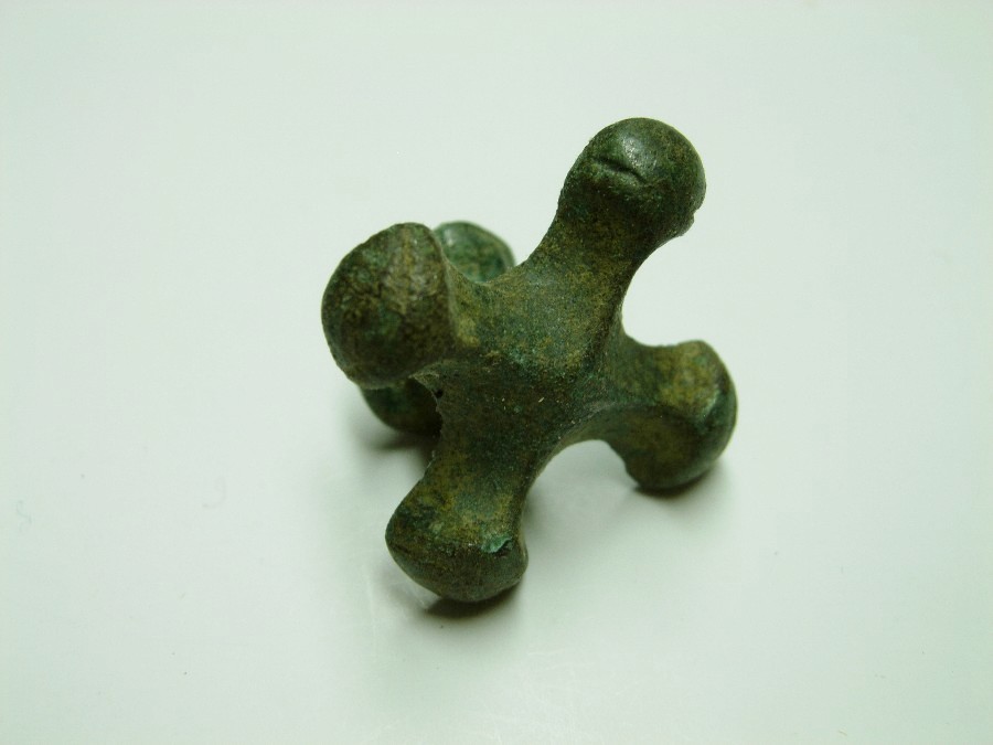 Kreuzförmiger Riemenbeschlag mit Zierrillen und massivem Befestigungsstift mit großem Gegenknopf. Bronze.