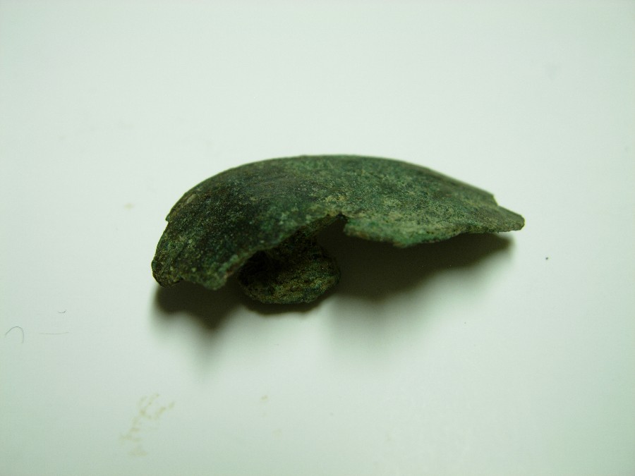 Frgt. eines Nietkopfsporen mit Dreipunkthalterung vom Typ Leuna (?). Erhalten ist eine Nietscheibe mit Nietloch und durch Querprofilierung abgesetzte, frgt. Bügel mit dachförmigem Querschnitt.