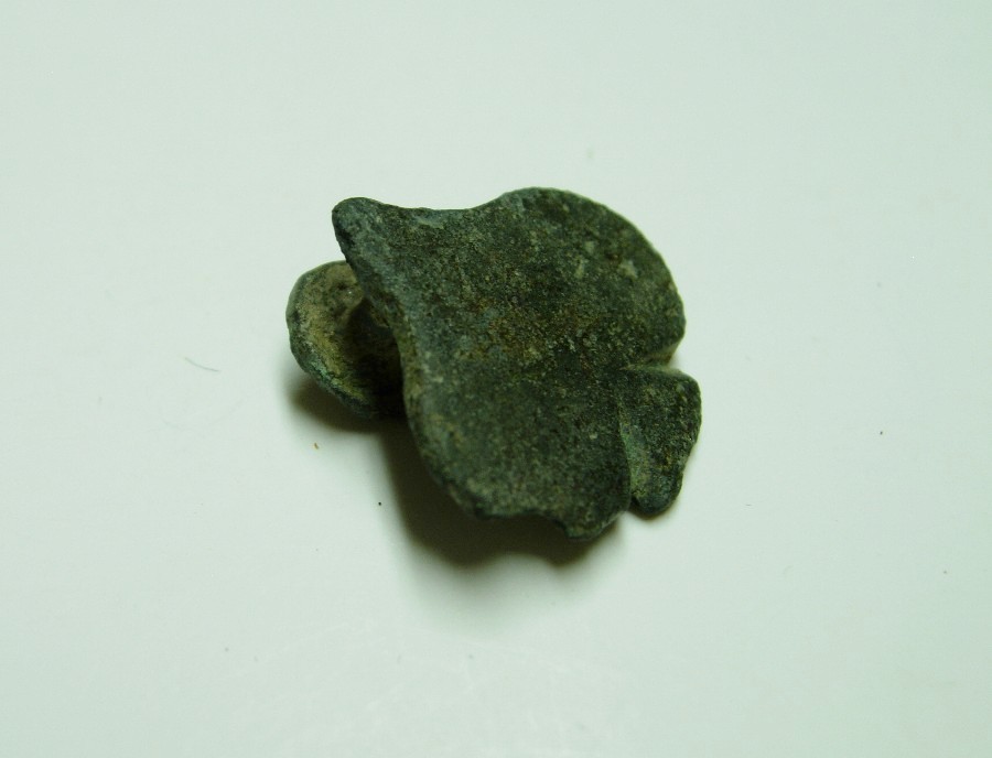 Frgt. eines Anhängers, nur herzförmige Platte mit Ansatz des Kopfes erhalten. Bronze.