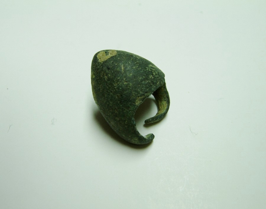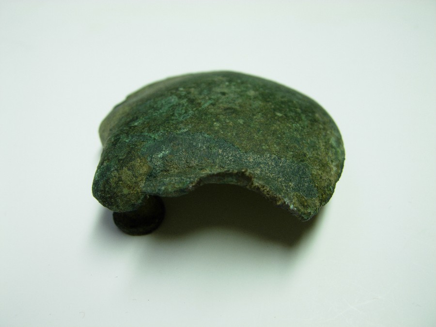 Muschelförmiger Riemenbeschlag, leicht frgt., mit zwei massiven Befestigungsstiften mit Gegenknopf. Bronze.