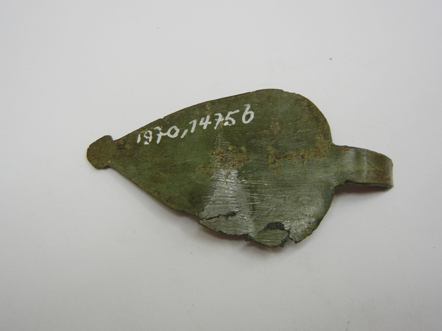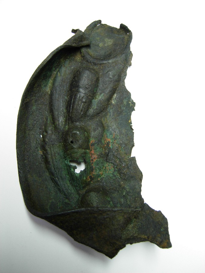 Frgt. eines Riemenbeschlags, nur herzförmige Platte mit Ansatz des Kopfes und ein Befestigungsstift mit Gegenplatte erhalten. Bronze.