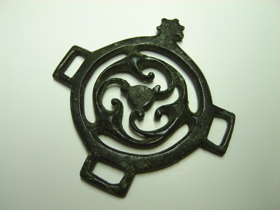 Durchbrochen gearbeiteter massiver runder Riemenverteiler mit sternförmigem Aufsatz und drei rechteckigen Riemendurchzügen. Verzierung möglicherweise linksläufiges Sonnenrad/Wirbel. Dm. 5 cm, Länge Ösen 1,6 – 1,7 cm, Breite Ösen 0,9 cm. Bronze.