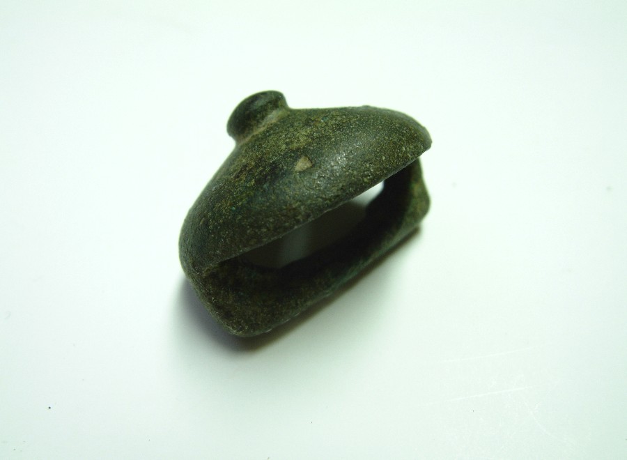 Runder Riemendurchzug mit gewölbter Kopfplatte mit zentralem Knopf und rechteckigem Bügel auf der Unterseite. Bronze.