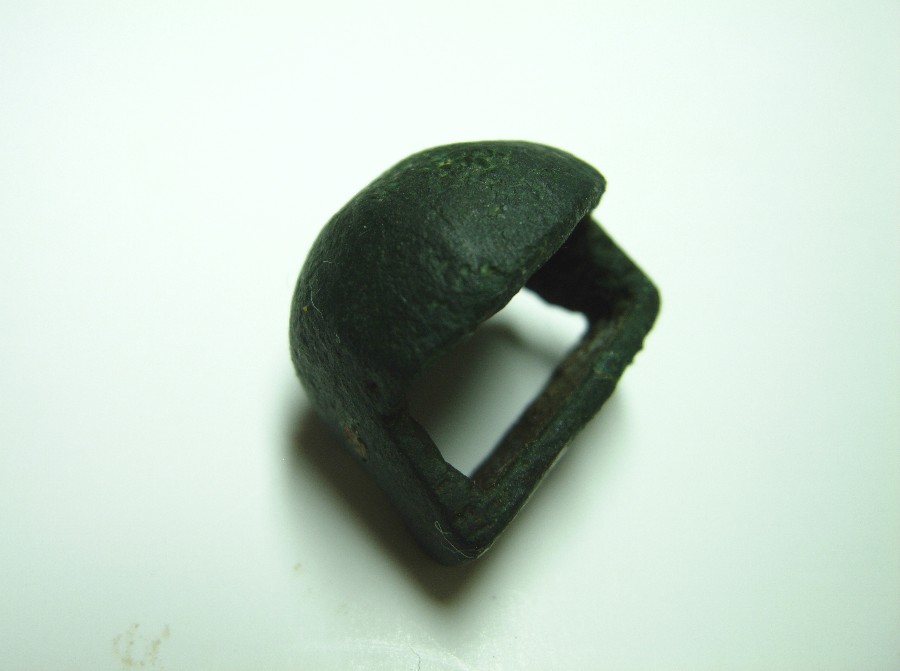 Mandelförmiger Riemendurchzug mit gerippter aufgewölbter Kopfplatte und rechteckigem Bügel auf der Unerseite. Bronze.