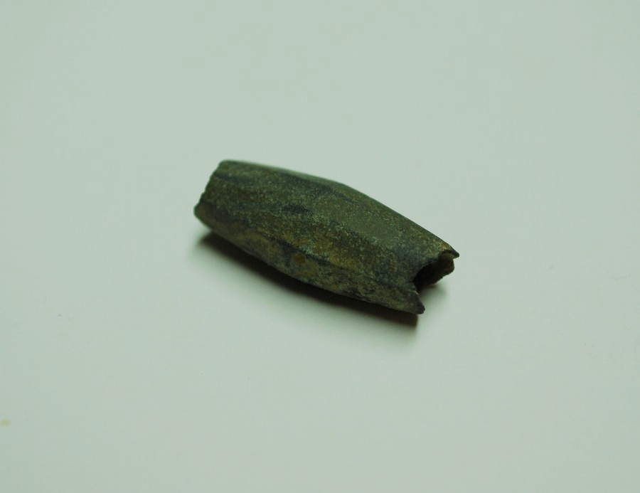 Polygonal längsfacettierte Riemenhülse, leicht frgt. Bronze.