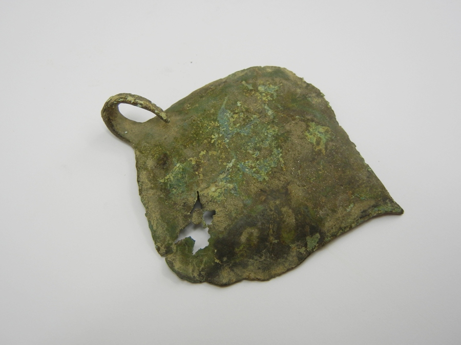 Blattförmiger Anhänger mit Aufhängung/Öse. L. 7,8 cm, B. 6,2 cm. Bronze.