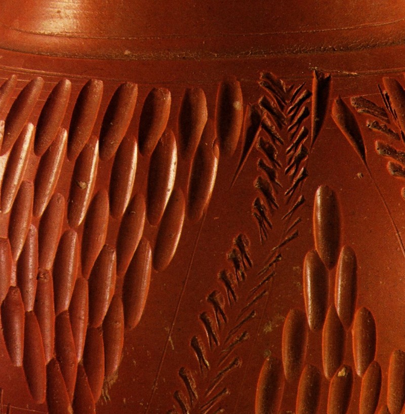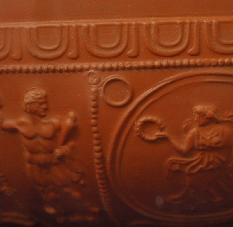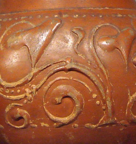 Die Oberfläche konnte bei bestimmten Formen in Reliefmanier (1), mit Barbotineauflage (2) oder in Schlifftechnik (3) figürlich oder ornamental verziert sein. Die hübscheste, aber auch chronologisch interessanteste Gattung ist die reliefverzierte Sigillata.